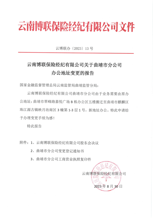 云南博聯保險經紀有限公司關于曲靖市分公司辦公地址變更的報告