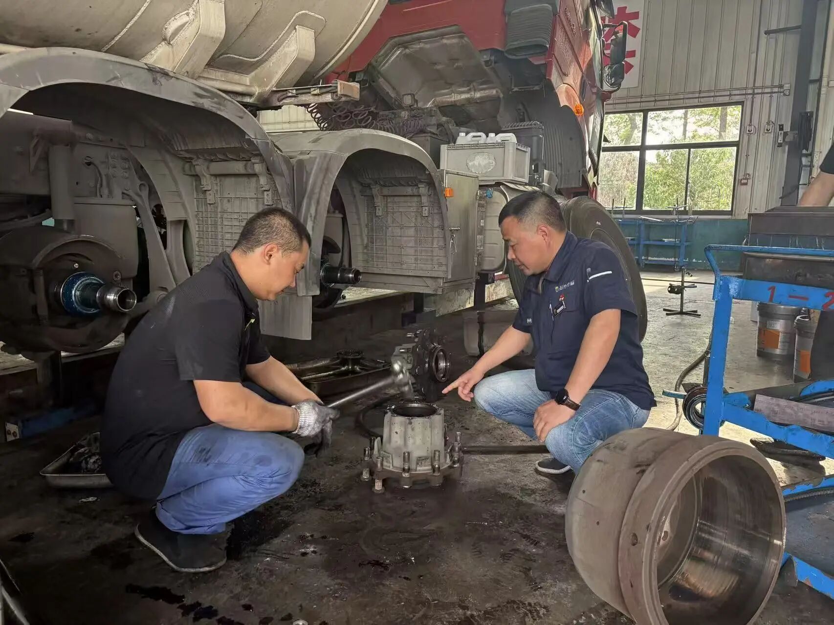 說(shuō)話間,一輛“疑難車”駛?cè)霃S區(qū)。駕駛員反映車輛底盤(pán)異響嚴(yán)重,伴有灼燒味。熊俊與同事立即上前,共同試車排查。最終,他們發(fā)現(xiàn)是制動(dòng)鼓因散熱不足導(dǎo)致變形摩擦。確定維修方案后,團(tuán)隊(duì)迅速更換配件,僅用兩小時(shí)就排除了故障。事后回訪時(shí),駕駛員連連稱贊:“這下可以安心跑國(guó)慶班次了!”